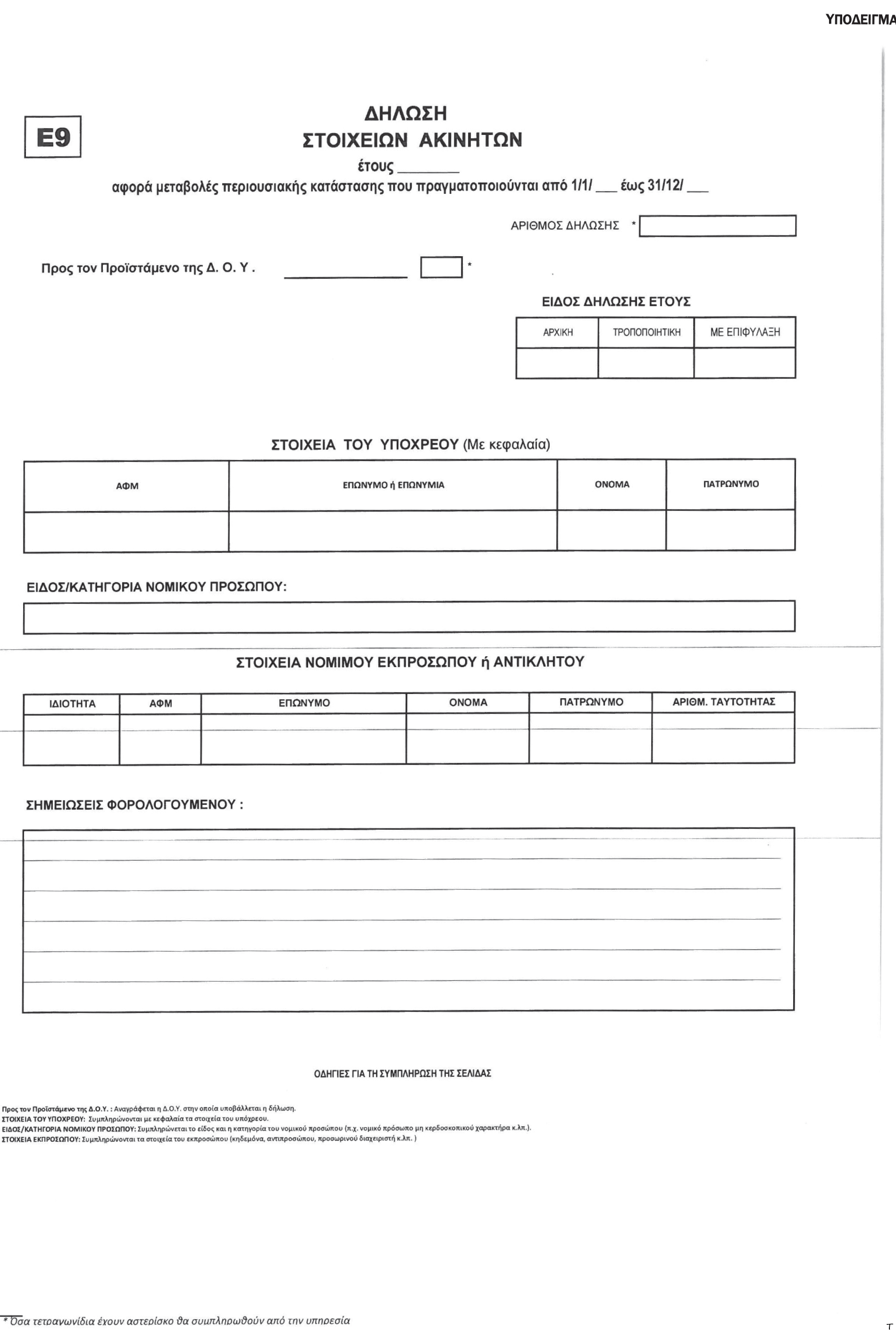 1. Ο τύπος και το περιεχόμενο της δήλωσης στοιχείων ακινήτων (Ε9) φυσικών και νομικών προσώπων, έχει ως το συνημμένο υπόδειγμα (έντυπο Ε9), το οποίο αποτελεί αναπόσπαστο τμήμα της παρούσας.